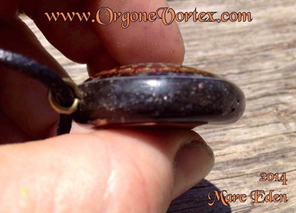 Each pendant has a unique fractal geometry mandala created by Marc Eden. Just behind the powerful mandala there is an orgone matrix of iron shavings mixed with several powdered crystals to include: